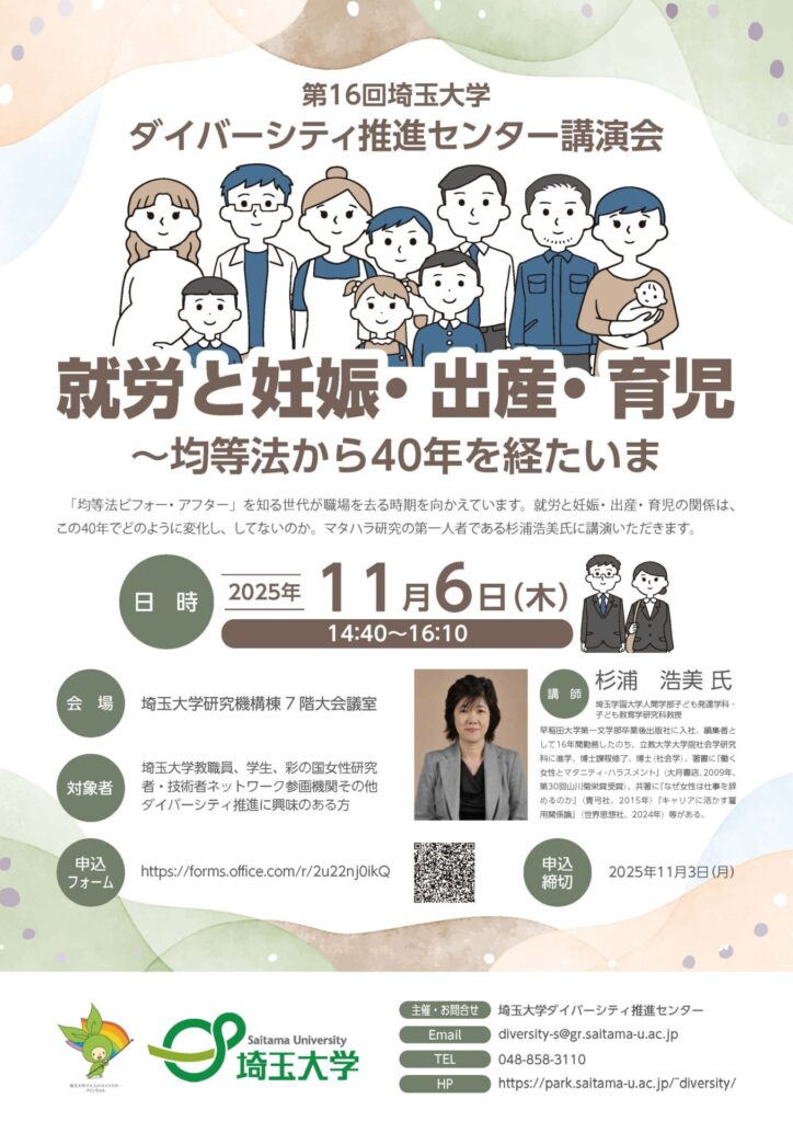2025年11月6日、第16回ダイバーシティ推進センター講演会「就労と妊娠・出産・育児 ~均等法から40年を経たいま~」を開催しました。マタニティ・ハラスメント(マタハラ)研究の第一人者である埼玉学園大学人間学部子ども発達学科・子ども教育学研究科教授の杉浦浩美氏を講師にお迎えし、女性の労働とケアをめぐる40年の歩みについてお話しいただきました。