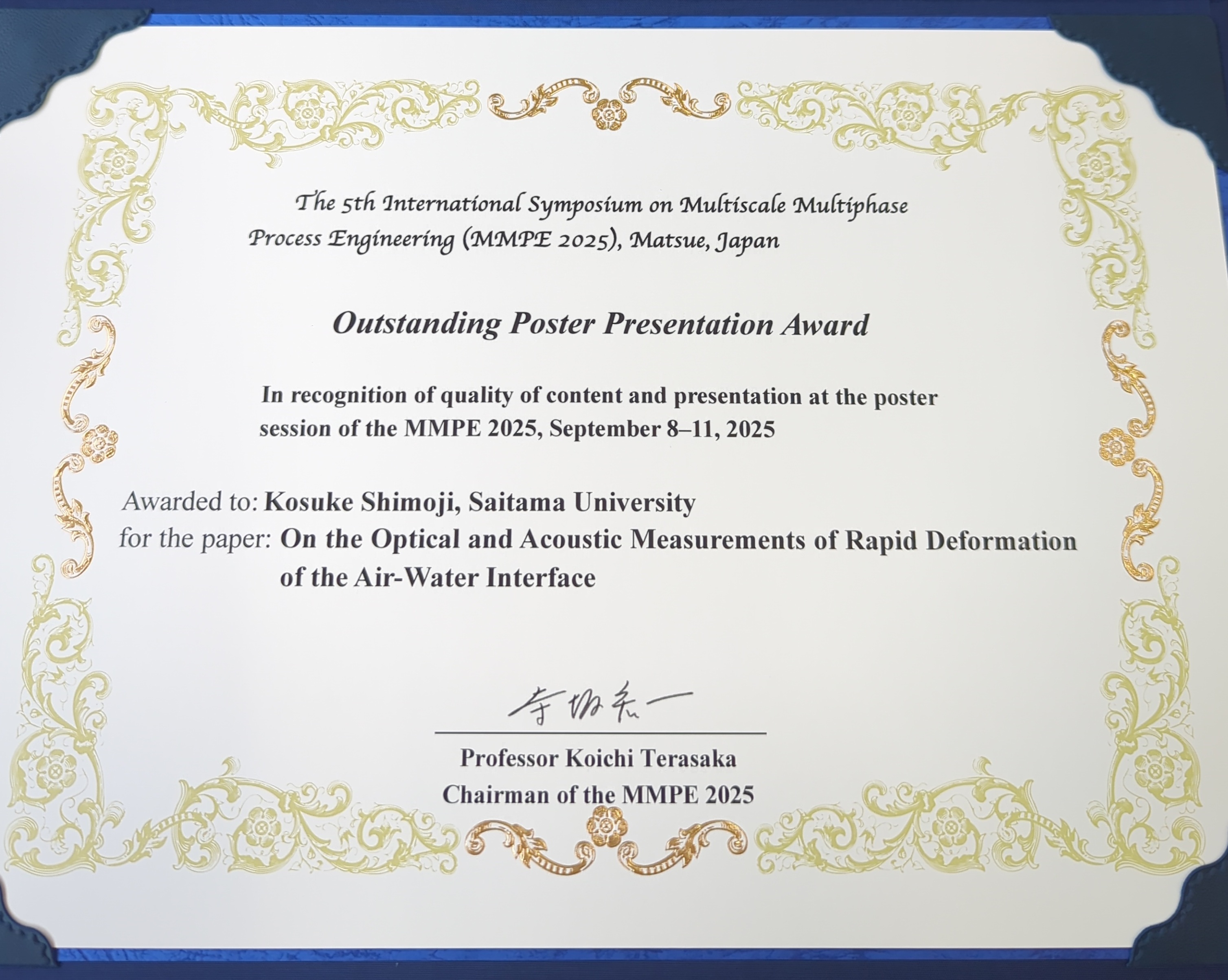 Kosuke (M1) also presented his work at the 5th International Symposium on Multiscale Multiphase Process Engineering (MMPE) and received the Best Poster Award.
