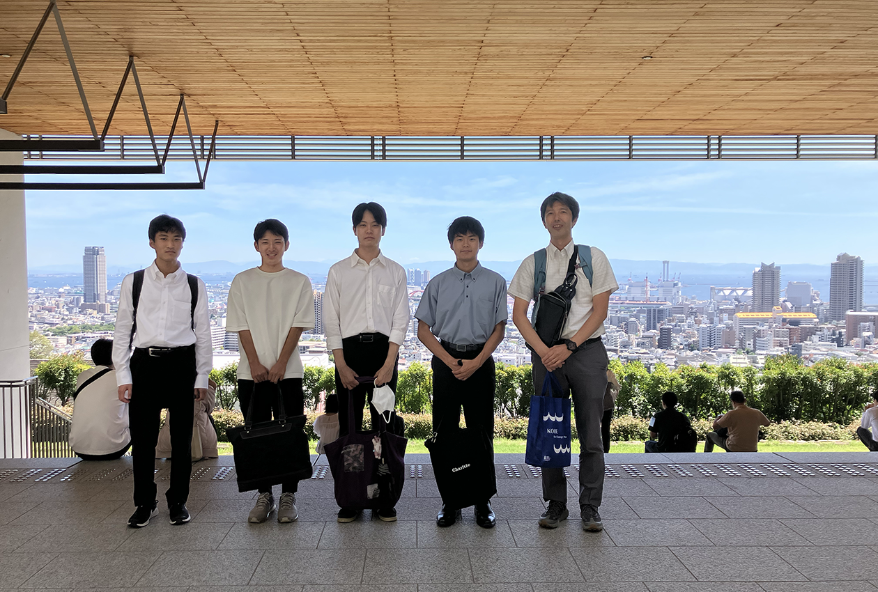 神戸の街が一望できる神戸大学百年記念館より。全員発表が終了したので、緊張感から解放されています。神戸大学で開催された、第42回日本植物バイオテクノロジー学会で向井くん、金澤くん、森くん、井窪くんが自身の研究成果を発表しました。緊張しながらも、堂々と発表や会場からの質問に対応していました。他の方の発表などを聞いたことで、今後の研究への刺激になったと期待しています。