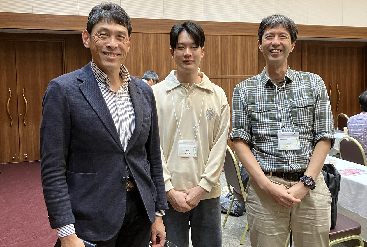 左から、出村拓奈良先端大教授、森くん、山口。KKRホテル熱海で開催された第19回細胞壁研究者ネットワーク研究会で森くんが自身の研究成果を発表しました 。宿泊先と発表会場が同じホテルということで、深夜まで参加者同士でコミュニケーションをとることができ、多くの仲間ができたと思います。