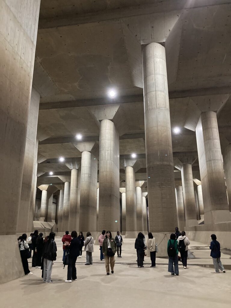ツアーでは、越谷市の大吉調節池とそこに隣接するキャンベルタウン野鳥の森、さらに春日部市の首都圏外郭放水路を見学しました。首都圏外郭放水路は高さ18メートル、重量500トンの柱59本から成るその壮大なスケールで埼玉の「地下神殿」という異名を持ちます。近隣河川の増水時には「調圧水槽」に水を取り込み、ポンプでくみ上げた水を放水路を通して江戸川へ排水する機能を有します。