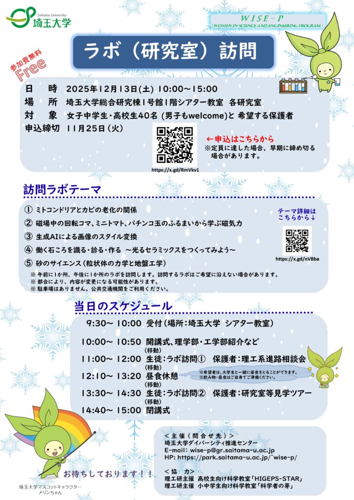 12月13日(土)、女子中学生・高校生(男子もwelcome)と希望する保護者向けに『ラボ(研究室)訪問』を開催します。